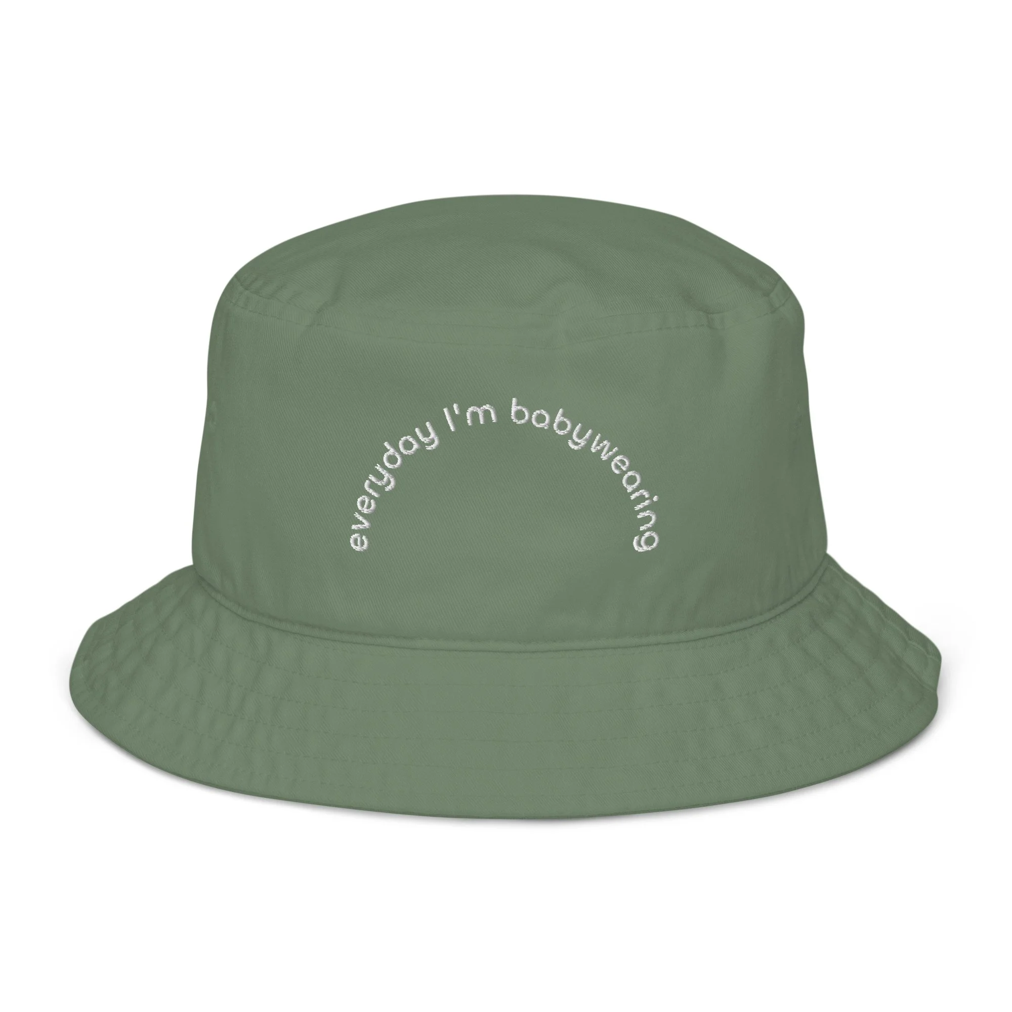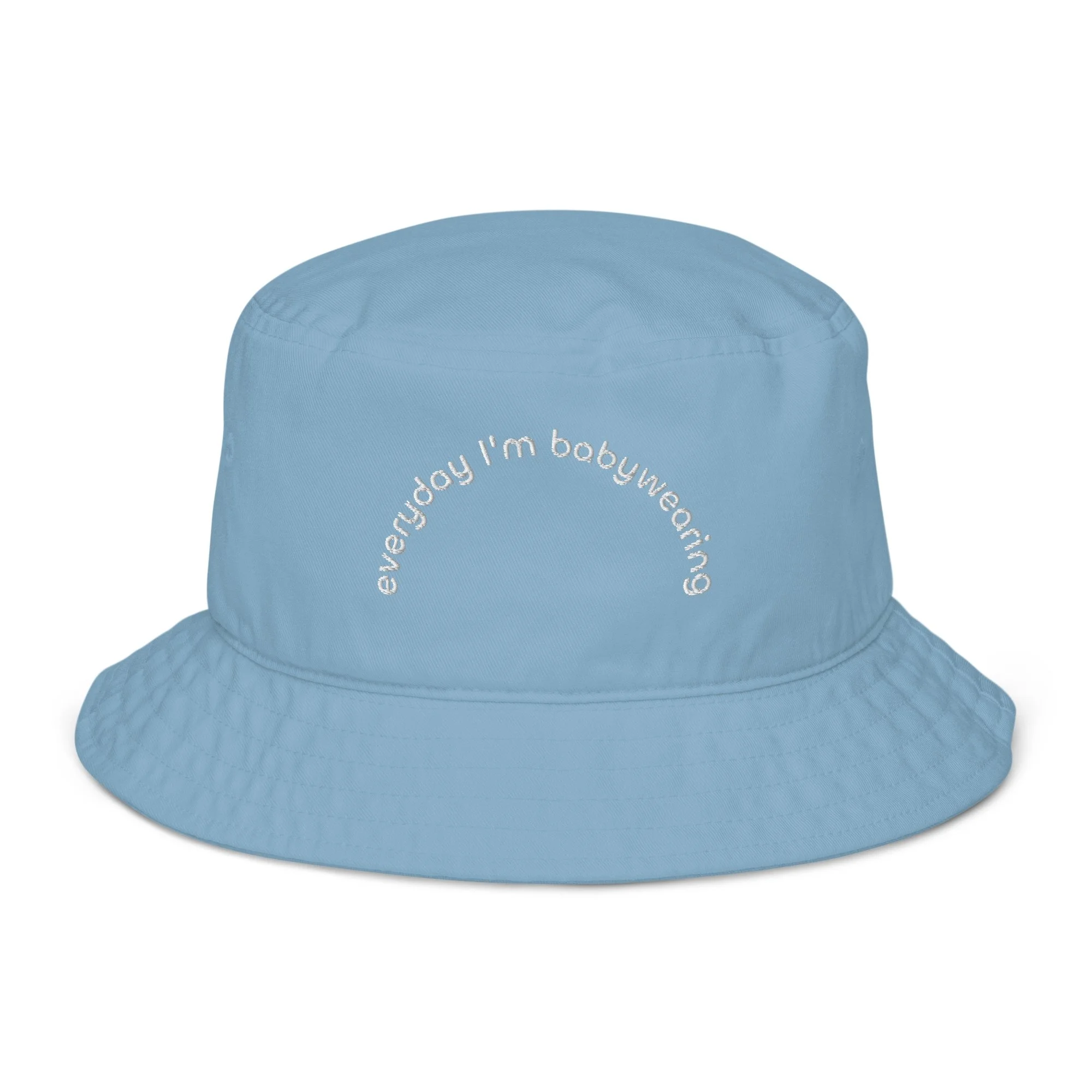 Embroidered design on an organic cotton twill bucket hat.